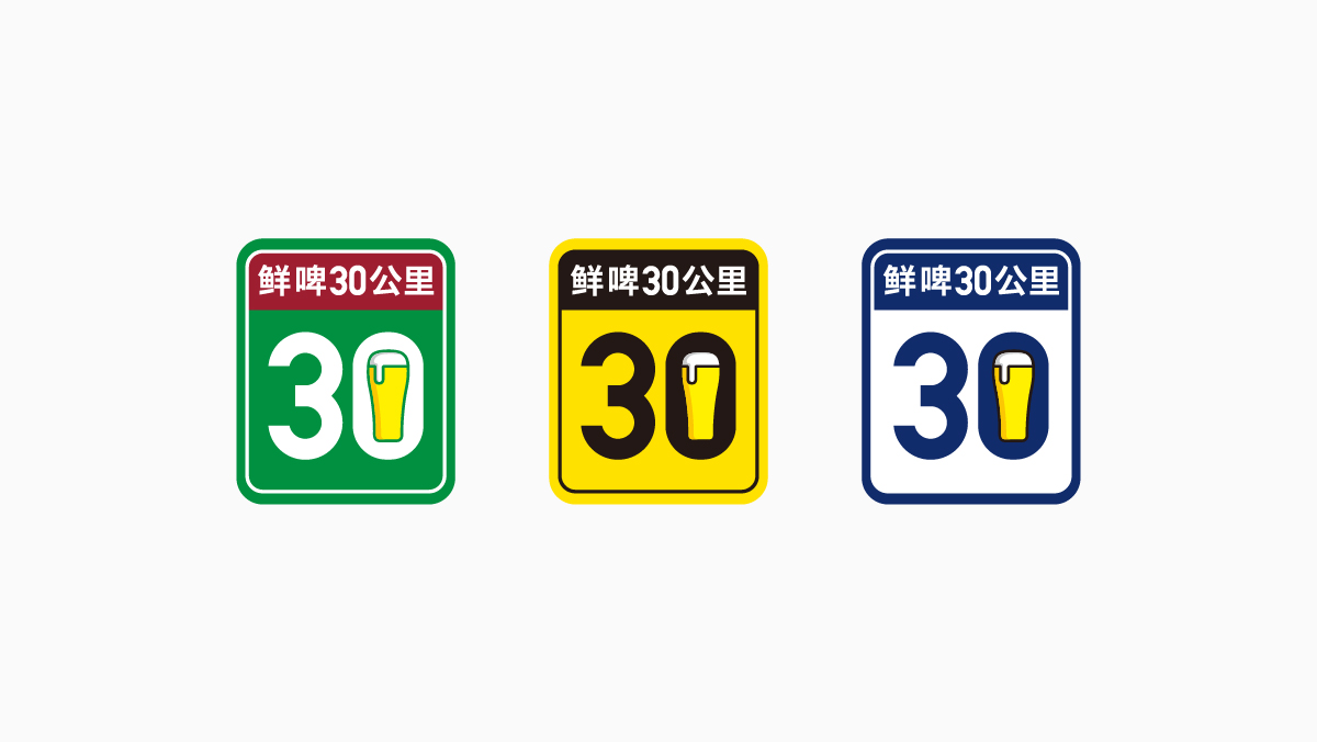突出30公里的超级路牌,原设计稿是66号公路的盾标路牌,30公里是个非常直接的符号。大道至简,没有任何修饰的就是最好的设计,寻遍全世界路牌都是大色块衬底,这种大色块衬底是全世界公里牌的共性,这个共性就是超级符号最好的表现手段,66号公路的盾标形态不具备这个超级性。盾标的外形符号太强,不管什么图形及文字只要装进它的图形容器里,首先瞥到的是盾牌的外形,而我们要突出的超级符号是“30”公里,所以,在视觉的顺序上颠倒了,我们要找回它原本的面貌。很多人认为盾标有啤酒行业的属性因为在啤酒行业很多品牌都喜欢盾标做标志,品牌标志设计也要看企业的历史,啤酒源于欧美,盾牌是他们的文化图腾,也是他们的文化母体,所以他们常用盾标。我们是30公里这一超级符号,大家每天上高速公路都能看到,所以应该选择中国的高速路牌开,既直接又符合常理。